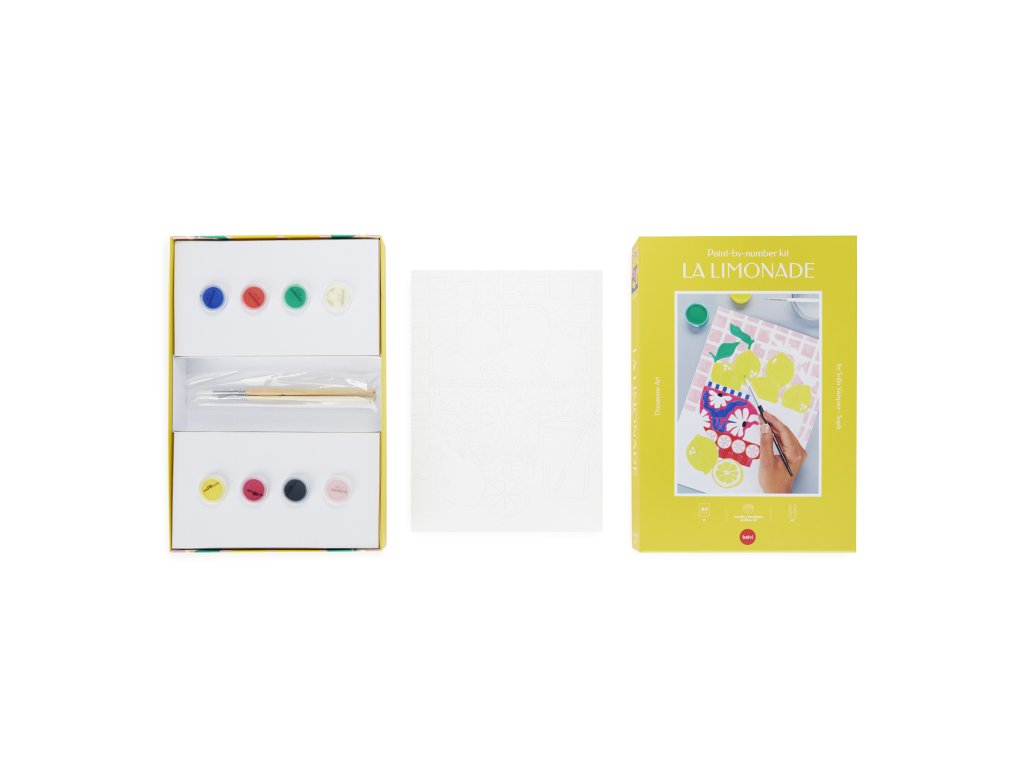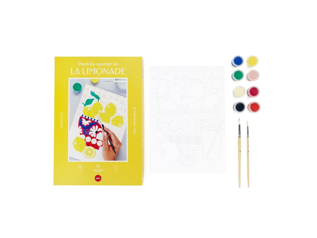 Balvi La Limonade je sada malování podle čísel ve formátu A4 s citronovým motivem od ilustrátorky Sofía Vázquez. V balení je papír 240 g, 8 akrylových barev a štětce velikosti 4 a 12, vše vyrobené v Evropě. Vhodné jako kreativní aktivita bez obrazovky a po dokončení i jako dekorace.
