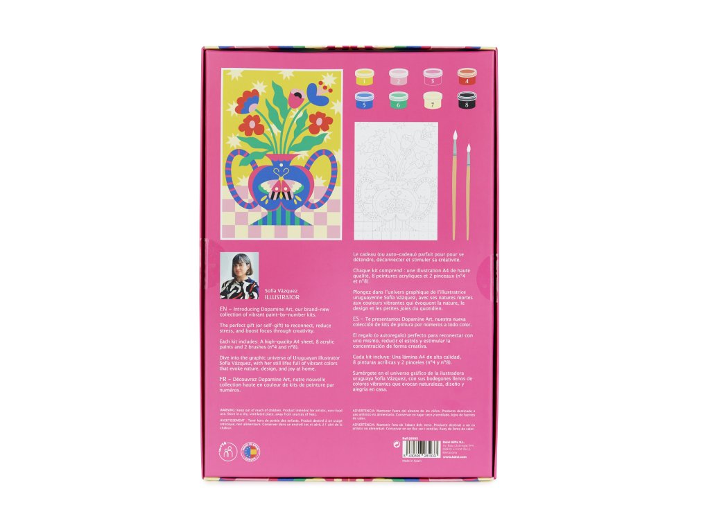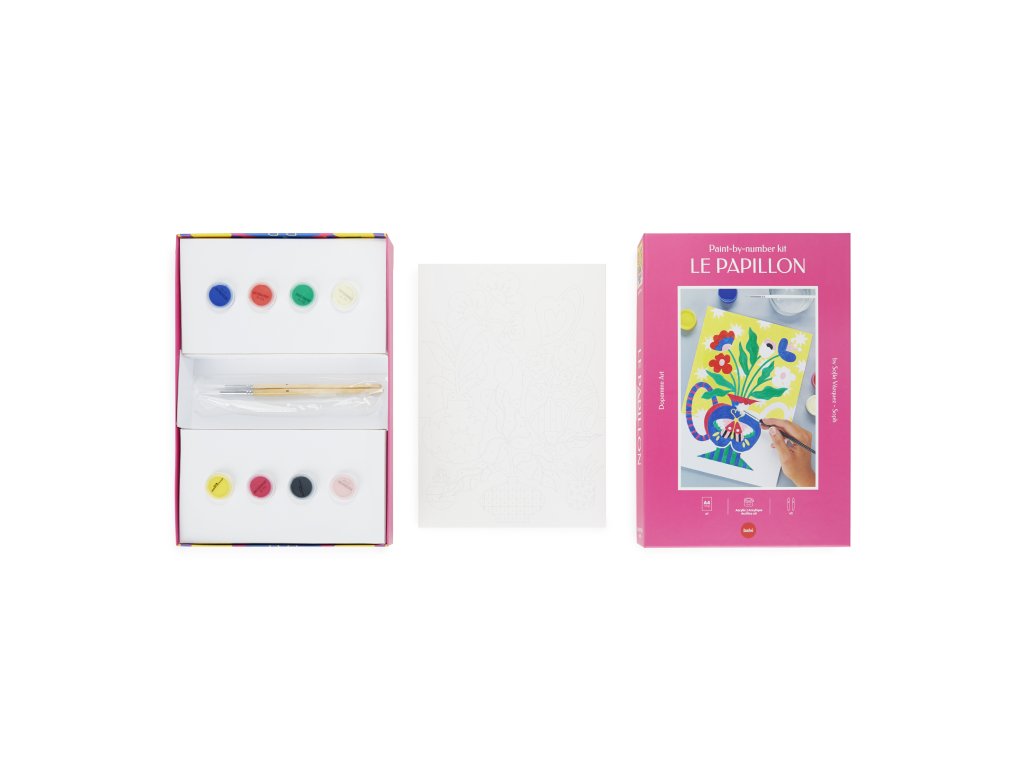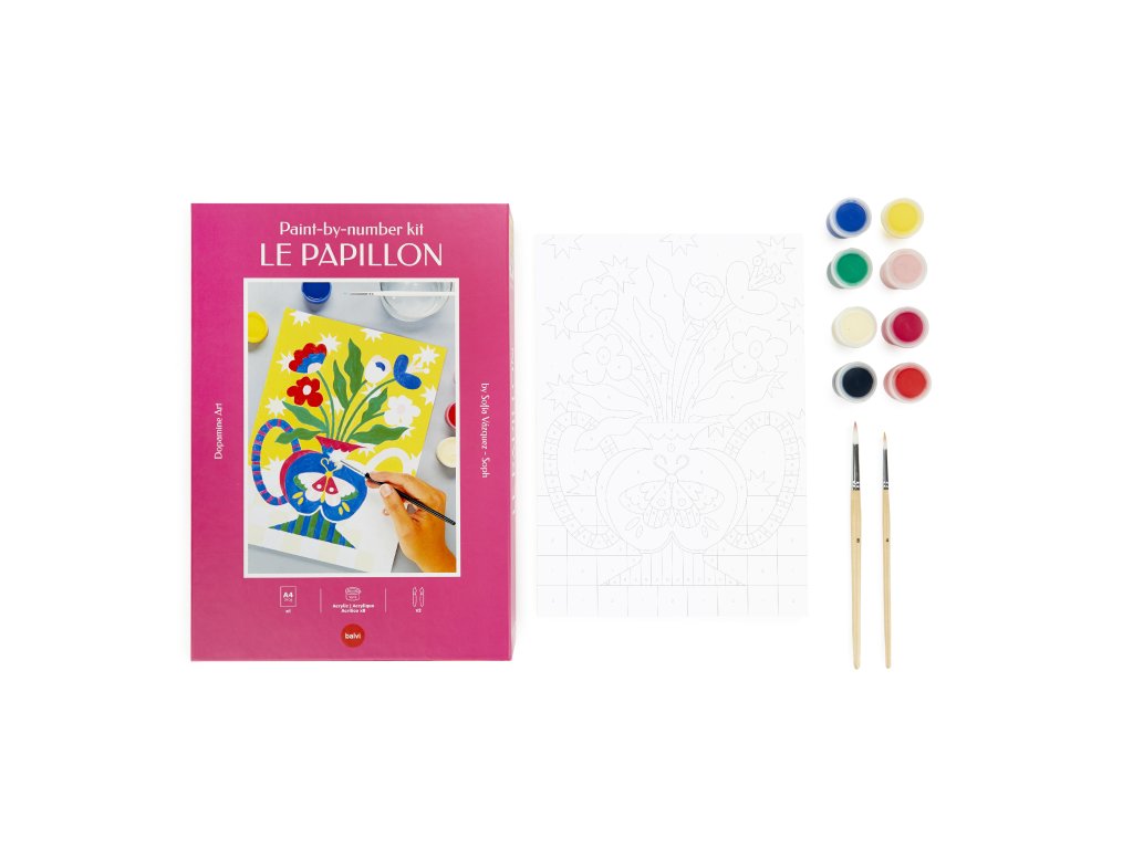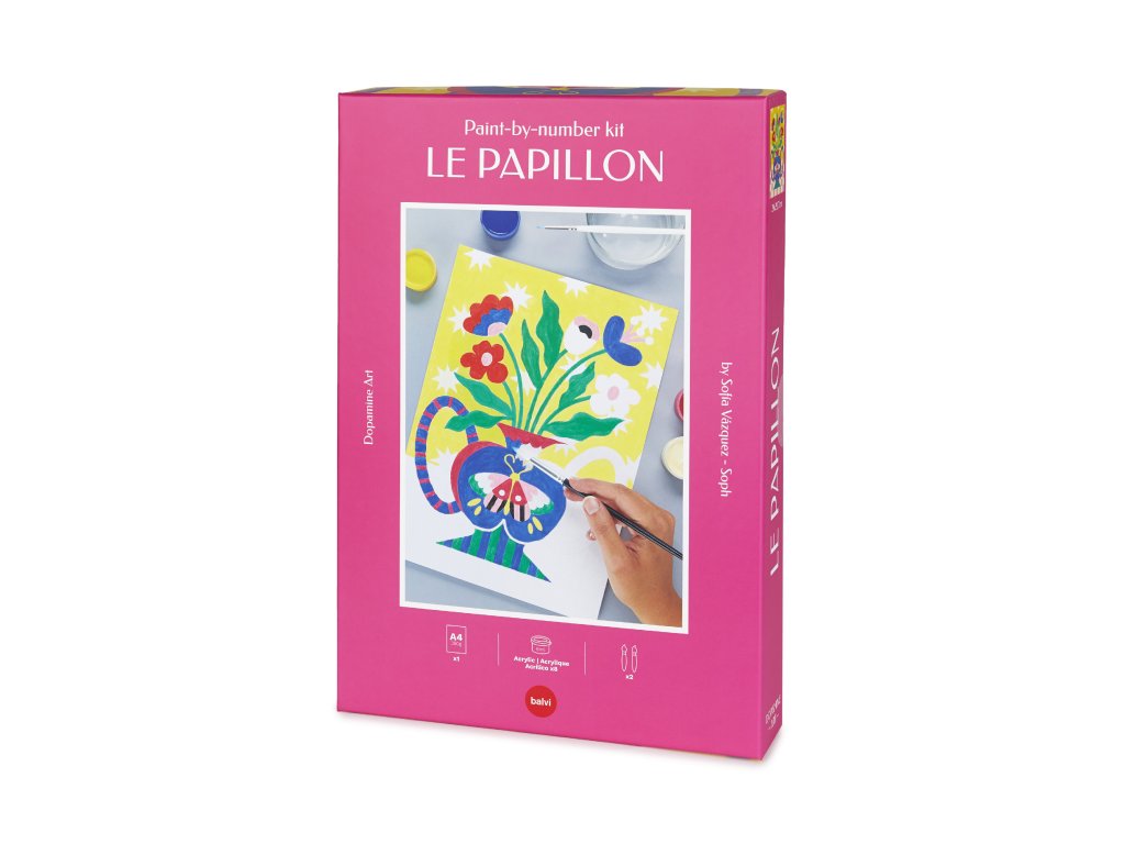 Balvi Le Papillon je sada malování podle čísel ve formátu A4 s motivem rostliny a motýla od ilustrátorky Sofía Vázquez. V balení je papír 240 g, 8 akrylových barev a štětce velikosti 4 a 12, vše vyrobené v Evropě. Vhodné jako kreativní aktivita bez obrazovky a po dokončení i jako dekorace.