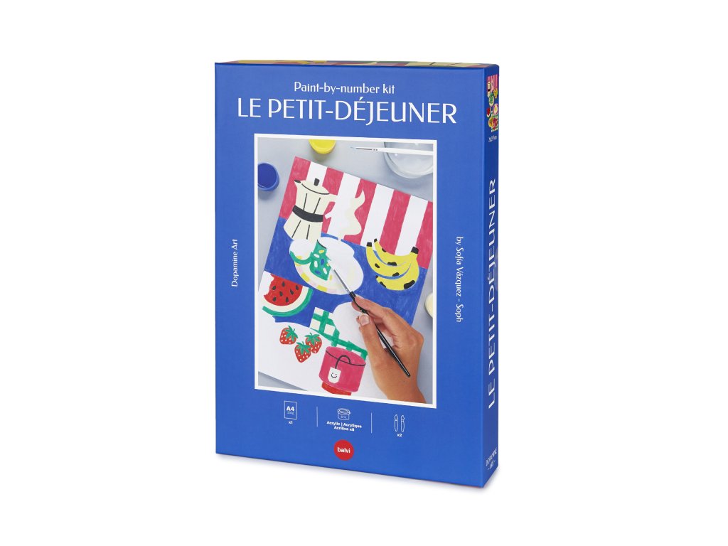 Balvi Le Petit-Déjeuner je sada malování podle čísel ve formátu A4 s motivem snídaně od ilustrátorky Sofía Vázquez. V balení je papír 240 g, 8 akrylových barev a štětce velikosti 4 a 12, vše vyrobené v Evropě. Vhodné jako kreativní aktivita bez obrazovky a po dokončení i jako dekorace.