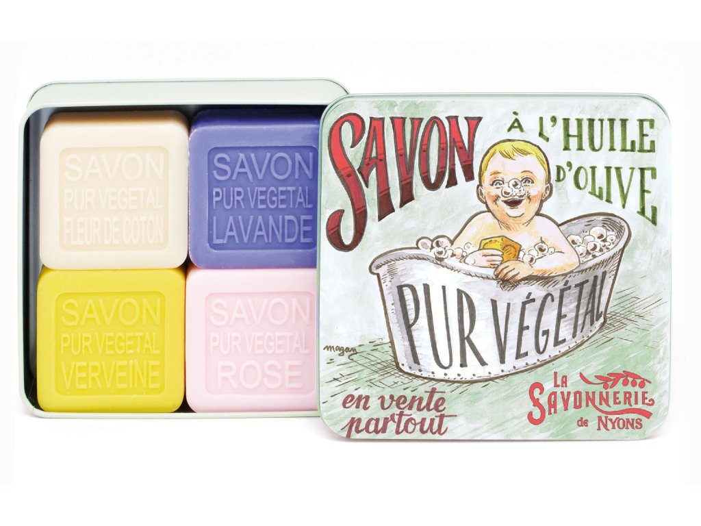 Značka: La Savonnerie de Nyons. Typ: dárková sada mýdel. Obsah: 4× tuhé mýdlo 100 g. Balení: plechová dóza. Motiv: Koupel miminka.