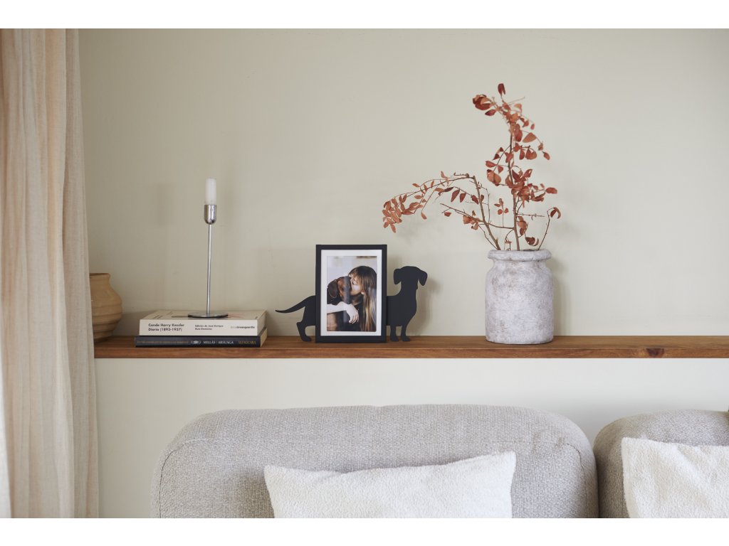 Balvi Teckel je fotorámeček ve tvaru jezevčíka, který z obyčejné fotky udělá výrazný detail interiéru. Černý kov působí čistě a dobře zapadne do moderního i hravějšího stylingu, přitom zůstává praktický pro každodenní používání. Rámeček je určený pro svislé fotografie 10 × 15 cm a díky protiskluzovým podložkám stojí stabilně na poličce, komodě nebo pracovním stole. Je to jednoduchý způsob, jak vystavit oblíbený moment a zároveň přidat do prostoru jemný humor a design.