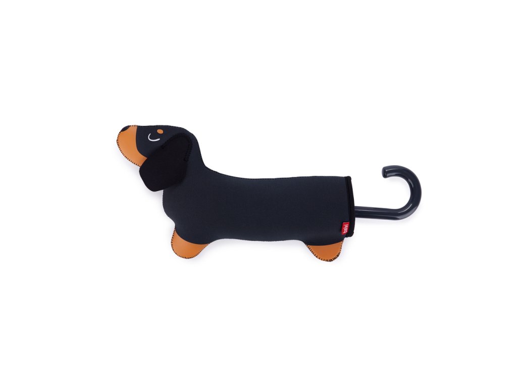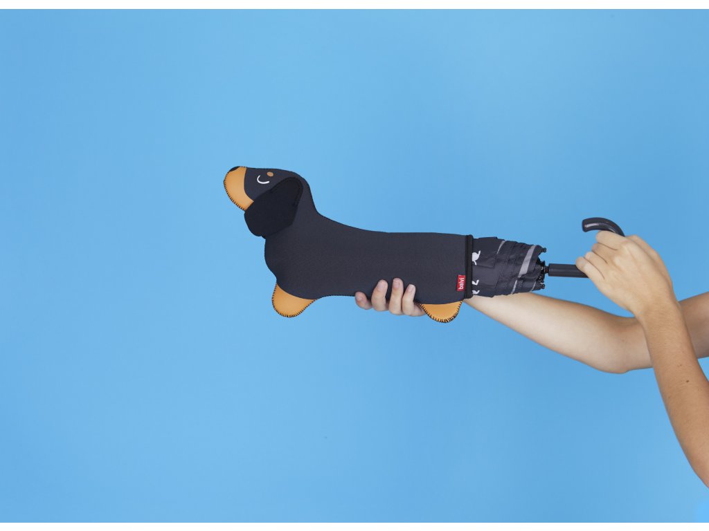 Skládací deštník Balvi Teckel je černý deštník s psím motivem a neoprenovým pouzdrem ve tvaru jezevčíka, které umožní uložit mokrý deštník do tašky bez promočení. Je kompaktní, v zavřeném stavu měří 31 cm a po otevření má průměr 98 cm. Vyrobený z nylonu. Design by: Balvi.