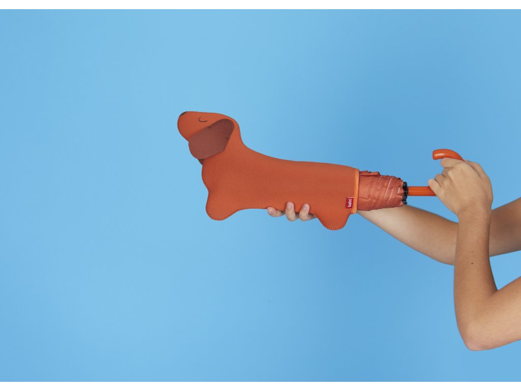 Skládací deštník Balvi Teckel je hnědý deštník s psím motivem a neoprenovým pouzdrem ve tvaru jezevčíka, které umožní uložit mokrý deštník do tašky bez promočení. Je kompaktní, v zavřeném stavu měří 31 cm a po otevření má průměr 98 cm. Vyrobený z nylonu. Design by: Balvi.