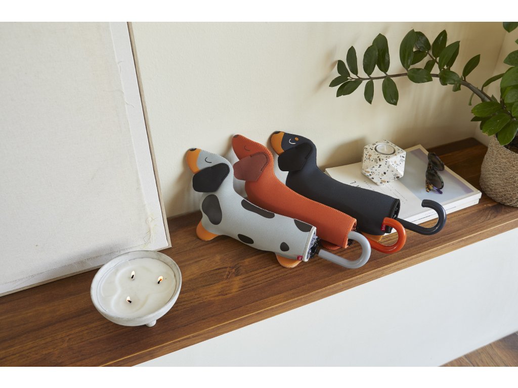 Balvi Teckel je skládací deštník, který přidá i dešti trochu designu. Deštník má psí motiv a hlavní detail je neoprenové pouzdro ve tvaru jezevčíka, které řeší praktickou věc: mokrý deštník můžete uložit do tašky nebo batohu bez toho, aby se vše kolem promočilo. Po zavření připomíná rukojeť ocásek, takže celek působí jako promyšlený doplněk, ne jen „deštník do kabelky“. Díky skládacímu provedení je snadno přenosný, v zavřeném stavu měří 31 cm a po otevření má průměr 98 cm. Hodí se jako dárek pro milovníky jezevčíků a pro každého, kdo chce mít funkční doplněk s nápadem.
