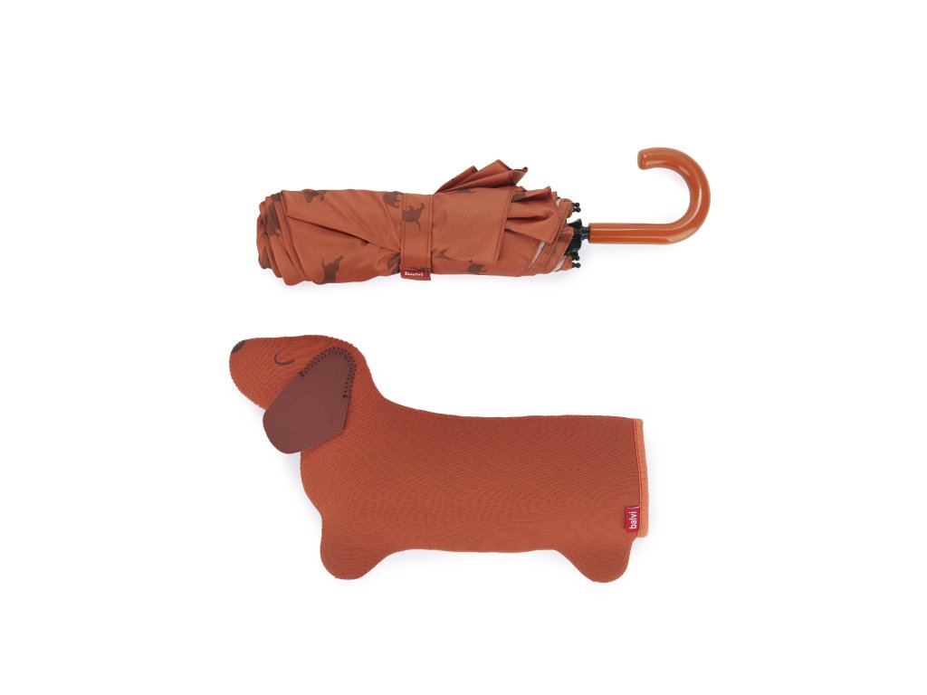 Značka: Balvi. Typ: skládací deštník. Motiv: Teckel (jezevčík). Barva: hnědá. Materiál: nylon. Rozměry produktu: 40 × 17 × 6 cm. Délka zavřeného deštníku: 31 cm. Průměr po otevření: 98 cm. Design by: Balvi.