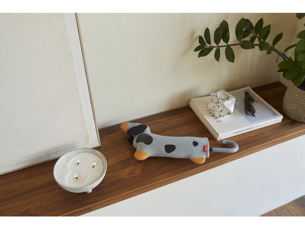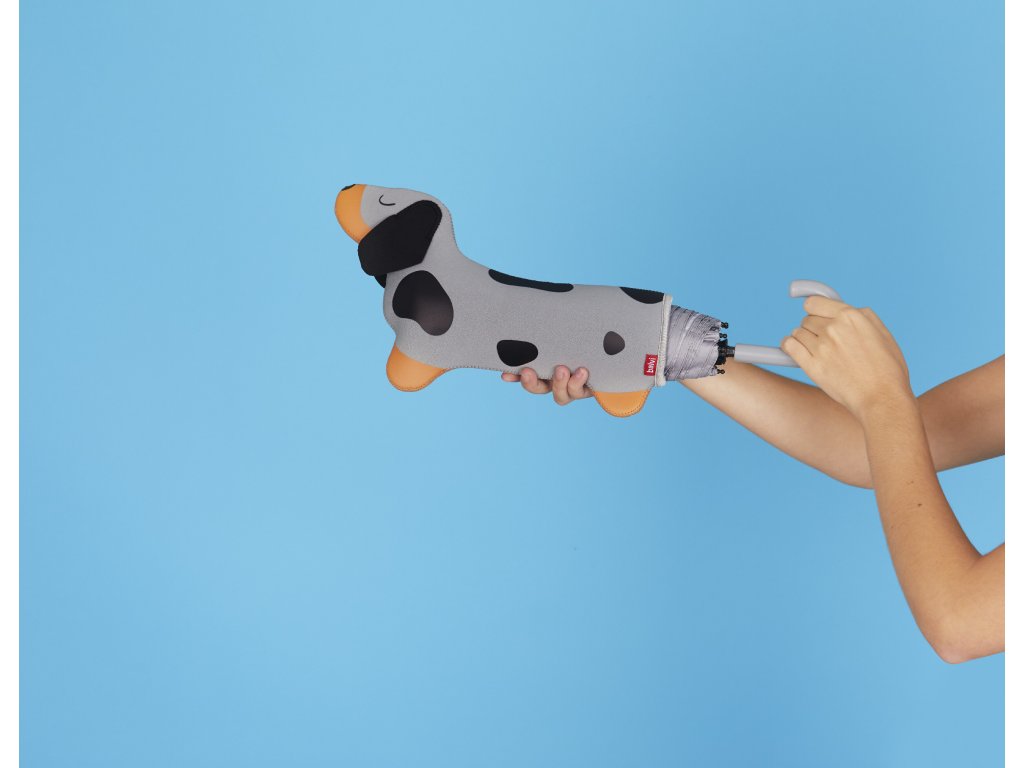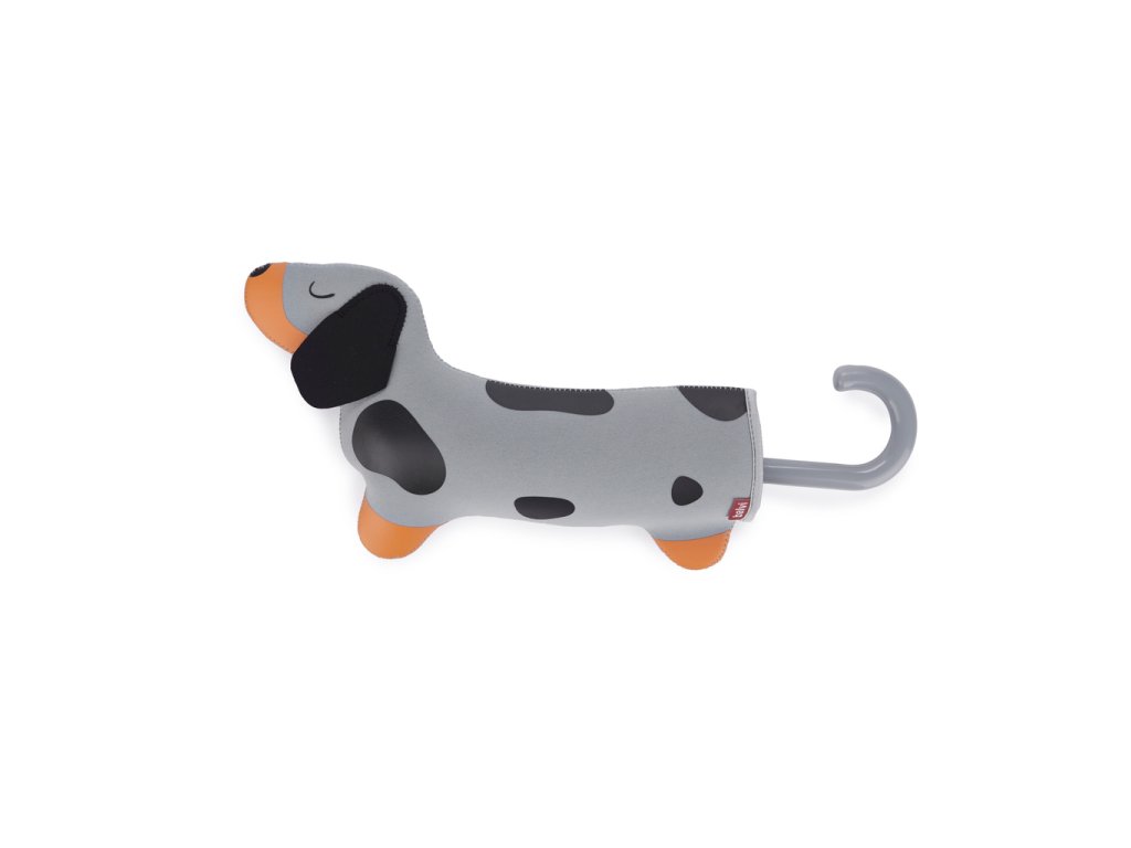 Skládací deštník Balvi Teckel je šedý deštník s psím motivem a neoprenovým pouzdrem ve tvaru jezevčíka, které umožní uložit mokrý deštník do tašky bez promočení. Je kompaktní, v zavřeném stavu měří 31 cm a po otevření má průměr 98 cm. Vyrobený z nylonu. Design by: Balvi.