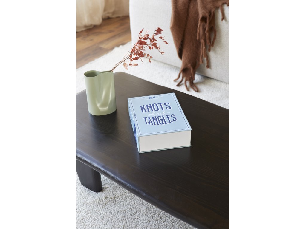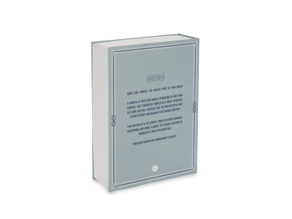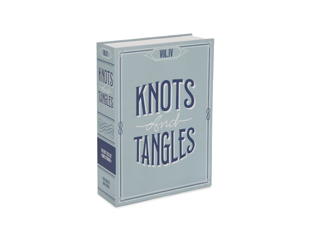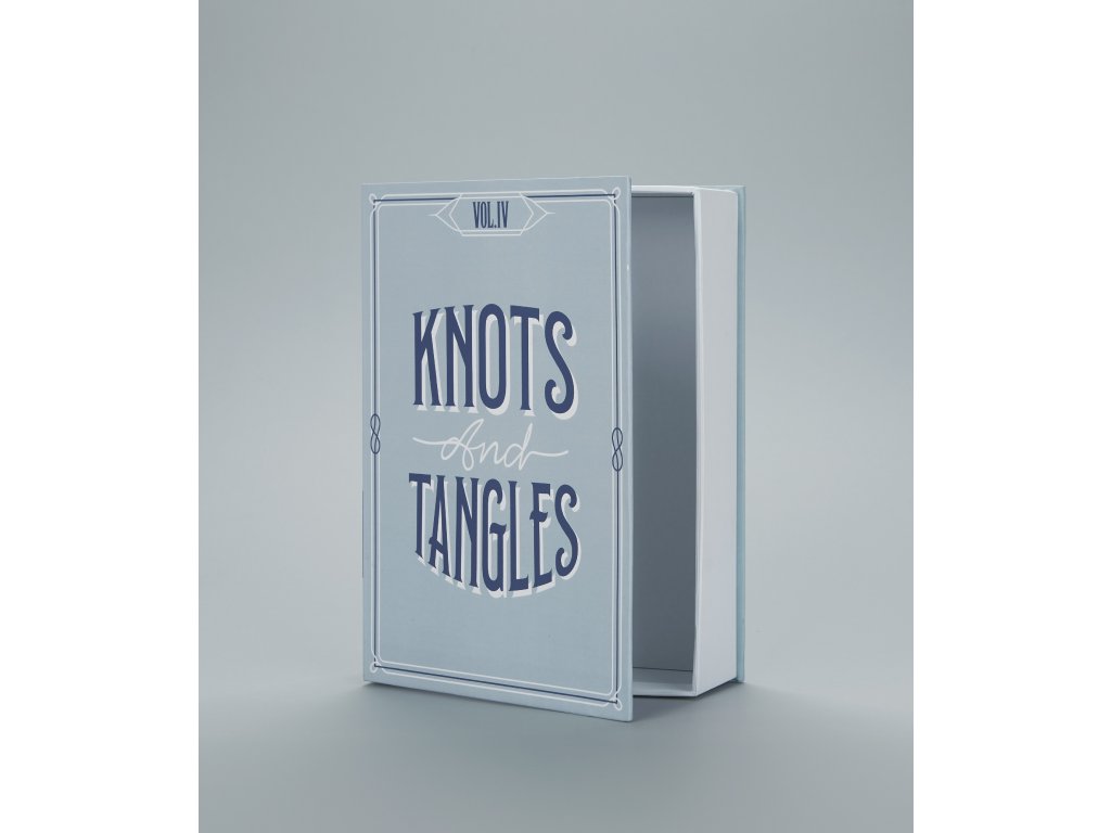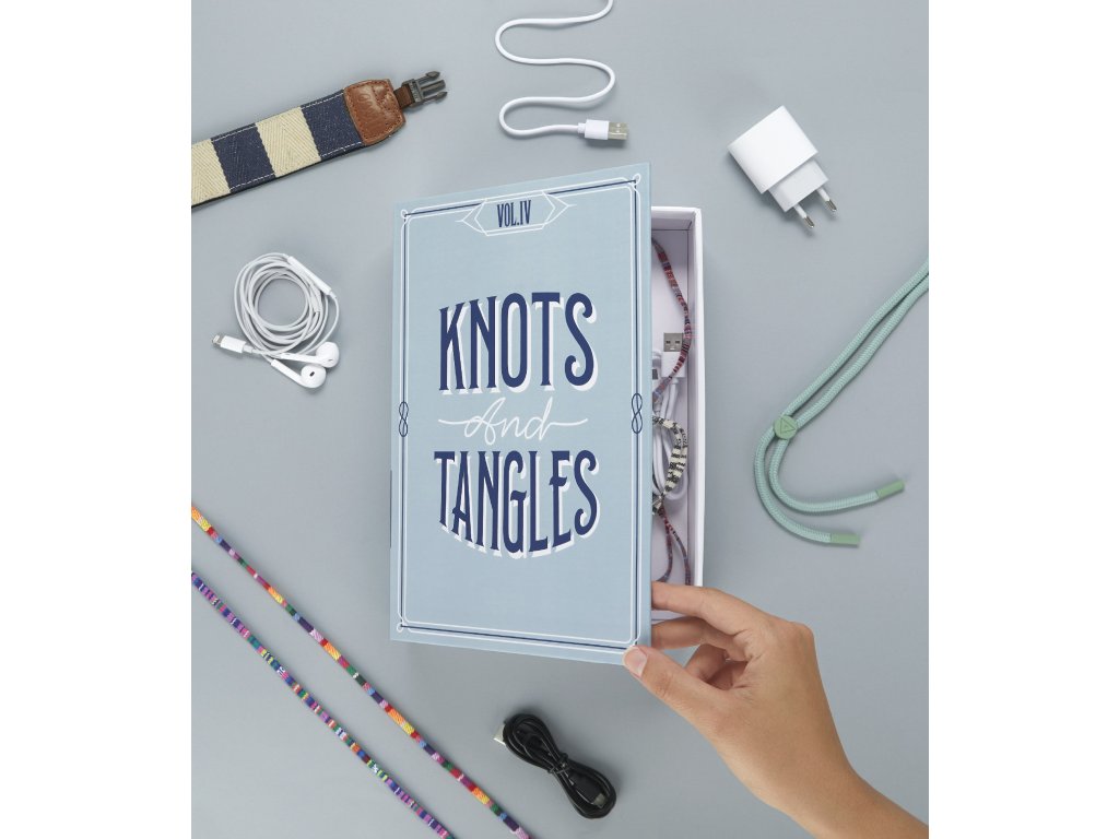 Balvi Knots and Tangles je kniha na ukládání, která slouží jako diskrétní úložný box na kabely, nabíječky a drobnosti. Vypadá jako běžná kniha do knihovny a má magnetické zavírání pro bezpečné uložení obsahu. Rozměry jsou 26 × 18,5 × 7 cm.