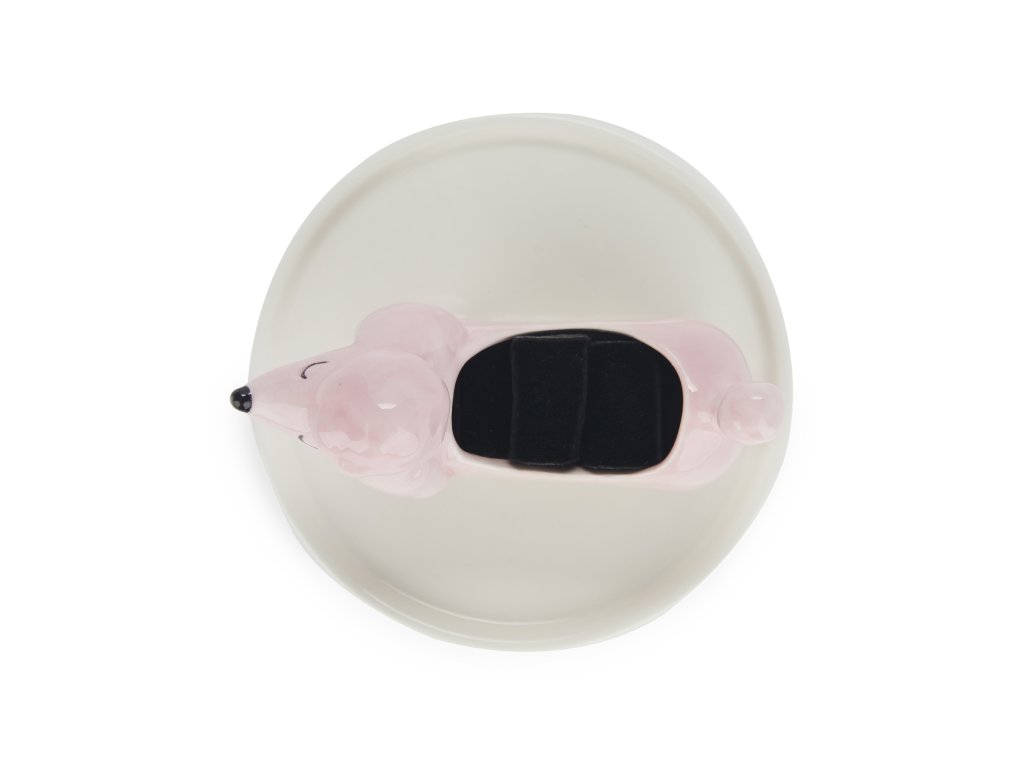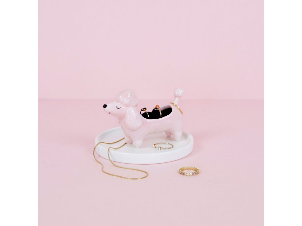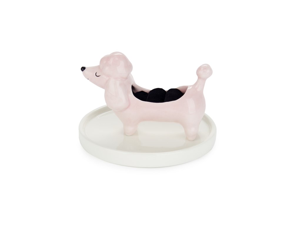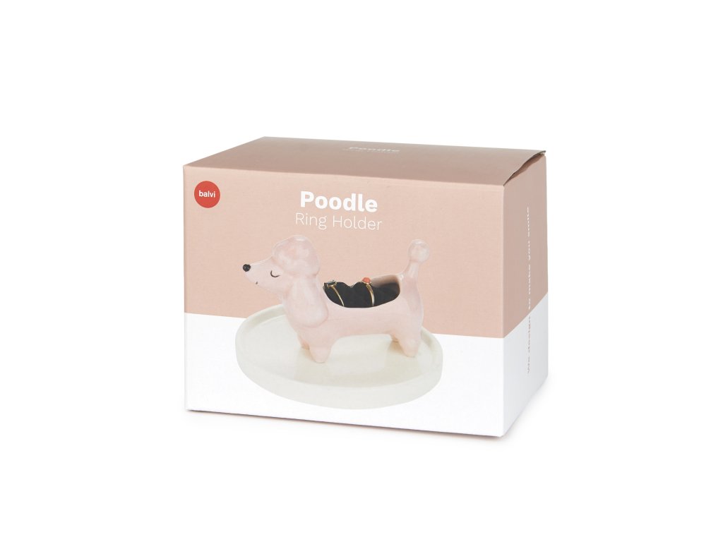 Značka: Balvi. Typ: stojánek na prsteny. Motiv: Poodle (pudl). Barva: růžová. Materiál: keramika. Rozměry: 7,5 × 11 × 11 cm. Design by: Balvi.