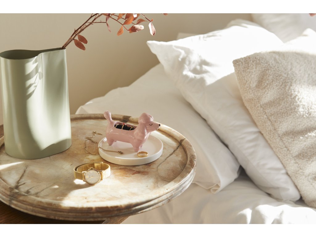 Balvi Poodle je stojánek na prsteny ve tvaru pudla, který propojuje dekoraci a každodenní praktičnost. Na nočním stolku, poličce nebo v koupelně vytvoří místo, kam odložíte šperky po příchodu domů, nebo si připravíte výběr na další den. Prsteny můžete navlékat na ocásek nebo ukládat na tělo, které je doplněné jemnou sametovou přepážkou pro přehledné uspořádání. Stojánek je vyrobený z kvalitní keramiky, ručně malovaný, a proto je každý kus originál. Hodí se jako dárek pro milovníky psů i šperků a pro každého, kdo má rád hravé, ale designově čisté doplňky do interiéru.