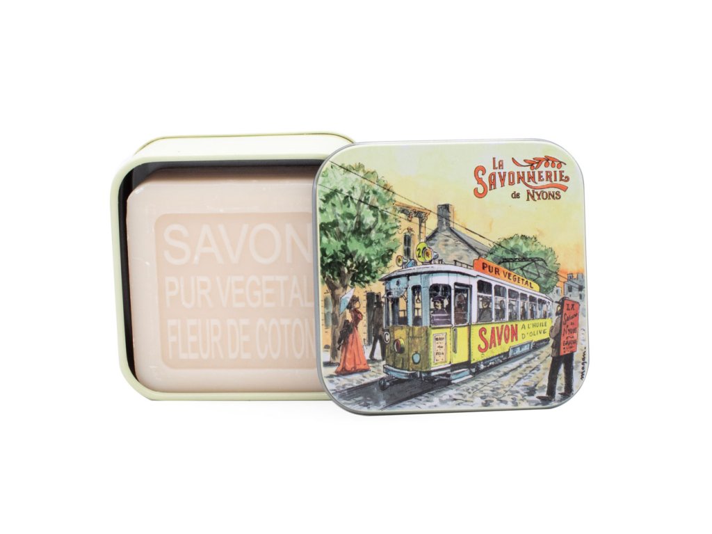 Francouzské tuhé mýdlo 100g v plechové dóze – Bavlník, Tramvaj z 30. let, La Savonnerie de Nyons