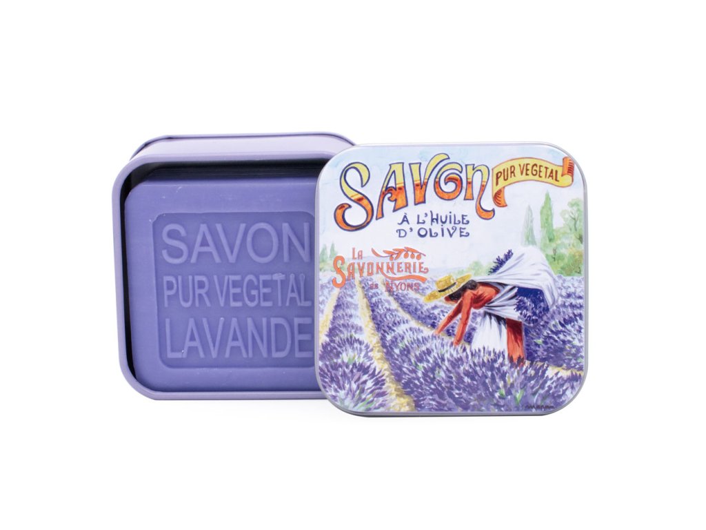 Francouzské tuhé mýdlo 100g v plechové dóze – Levandule, Sklizeň, La Savonnerie de Nyons