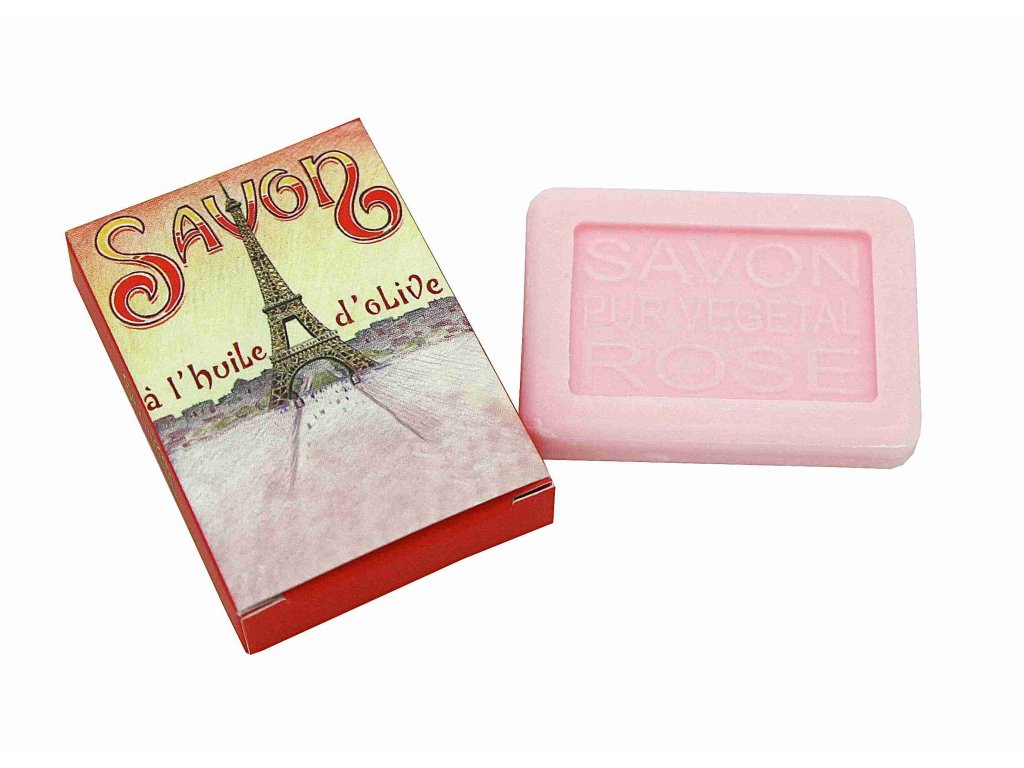 Přírodní mýdlo s romantickou vůní růže a pečujícím složením. Obsahuje BIO bambucké máslo a olivový olej z Nyons, které pokožku vyživují a chrání. Stylová papírová krabička s motivem Eiffelovy věže navodí atmosféru pařížské elegance – ideální jako suvenýr nebo malý dárek.