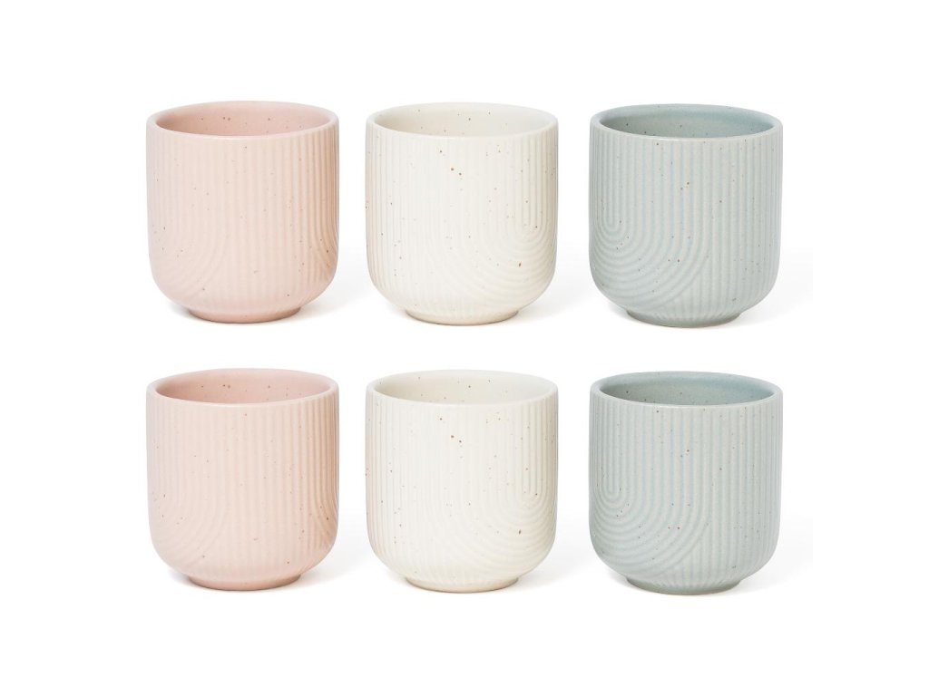 Sada šálků Mercury Lines je postavená na jednoduchém tvaru a příjemné textuře. Reliéfní linky a jemné tečkování glazury působí přirozeně a dodají stolování klidný, moderní detail. Pastelové odstíny se snadno kombinují a na stole vypadají upraveně i bez dalších dekorací.