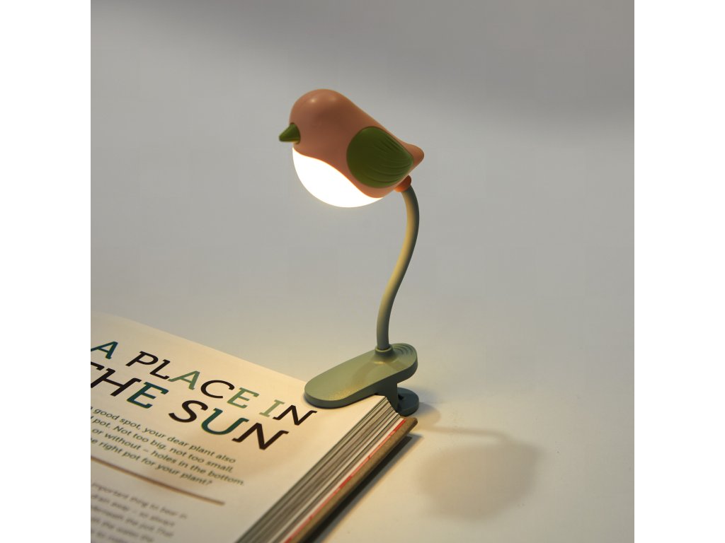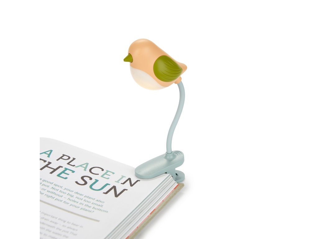 Lampička na čtení Balvi Birdie je clip-on světlo ve tvaru ptáčka, které umožní číst večer bez rušení okolí. Zapíná se jemným stiskem zobáčku. Protiskluzový klip drží na knize a ohebný krk nasměruje světlo na stránku. Je z plastu, v růžové barvě, má rozměry 13,5 × 3 × 4,3 cm a napájí ji 3× LR41 (součástí balení). Hodí se i jako dárek pro milovníky přírody a čtení.