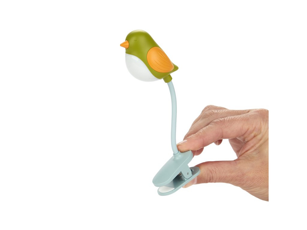 Lampička na čtení Balvi Birdie je clip-on světlo ve tvaru ptáčka, které umožní číst večer bez rušení okolí. Zapíná se jemným stiskem zobáčku. Protiskluzový klip drží na knize a ohebný krk nasměruje světlo na stránku. Je z plastu, v zelené barvě, má rozměry 13,5 × 3 × 4,3 cm a napájí ji 3× LR41 (součástí balení). Hodí se i jako dárek pro milovníky přírody a čtení.
