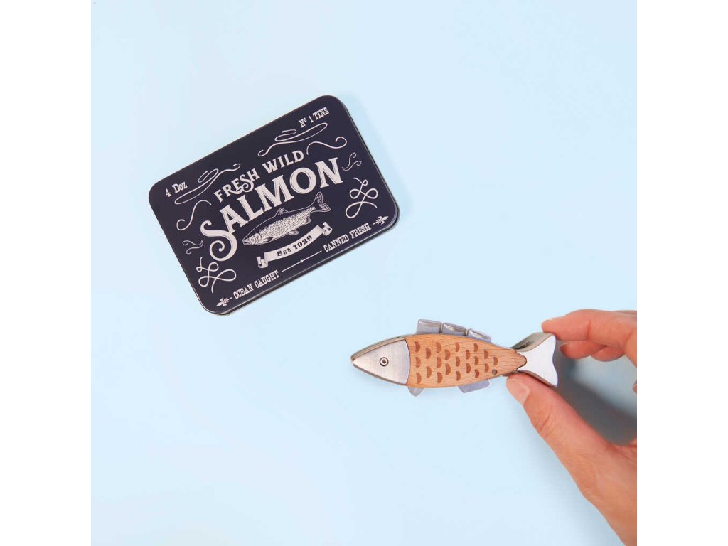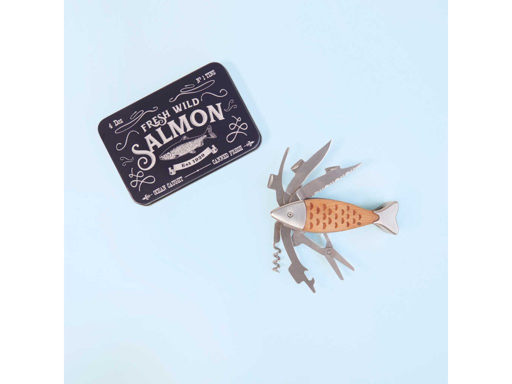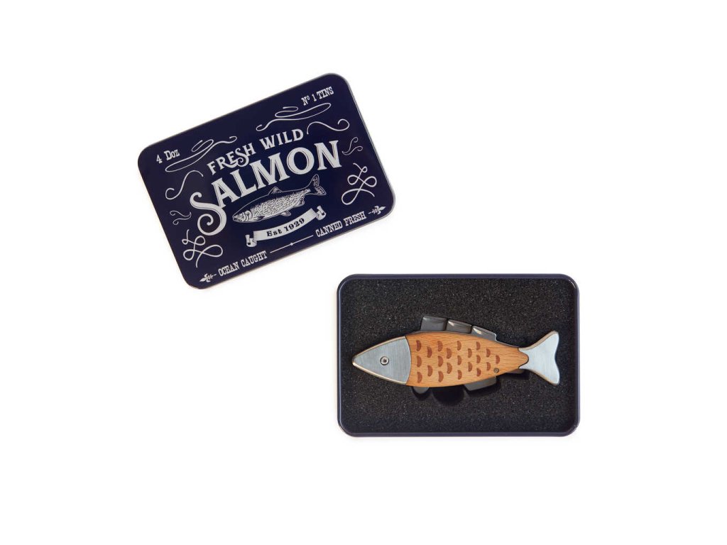 • Unikátní design – Multifunkční nástroj ve tvaru lososa. Dodáván v plechové krabičce s barevnou grafikou, která slouží i jako dekorace.