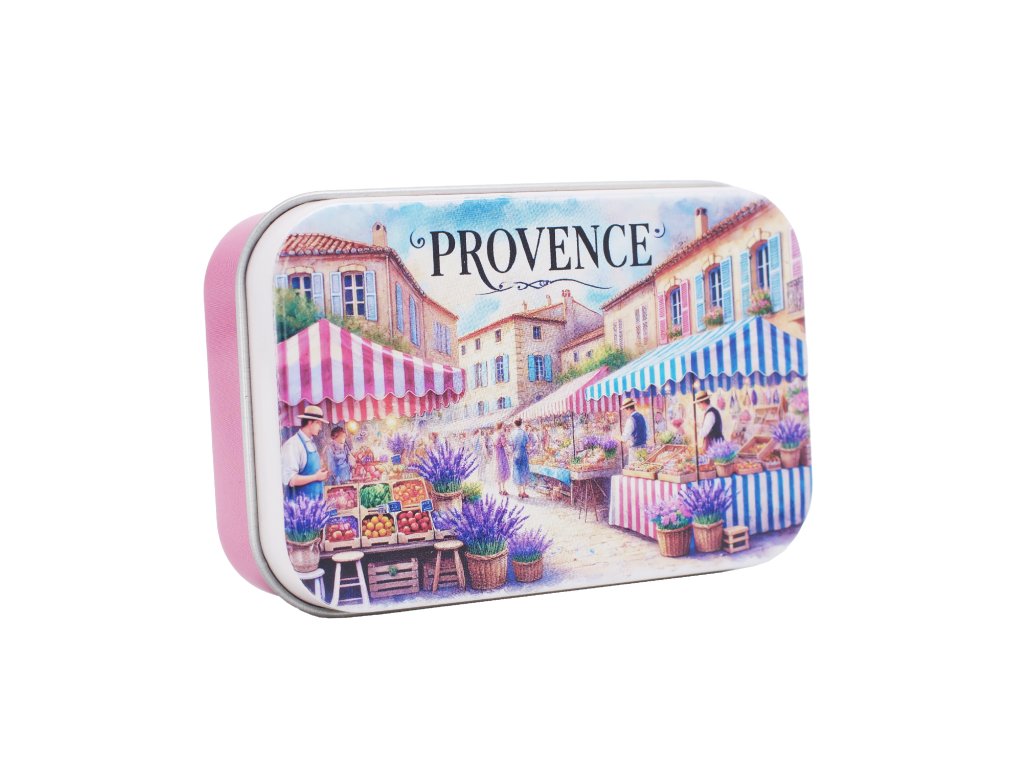 Značka: La Savonnerie de Nyons. Typ: plechová dóza na mýdlo. Kapacita: pro mýdlo 100 g. Provedení: prázdná. Motiv: Trh.