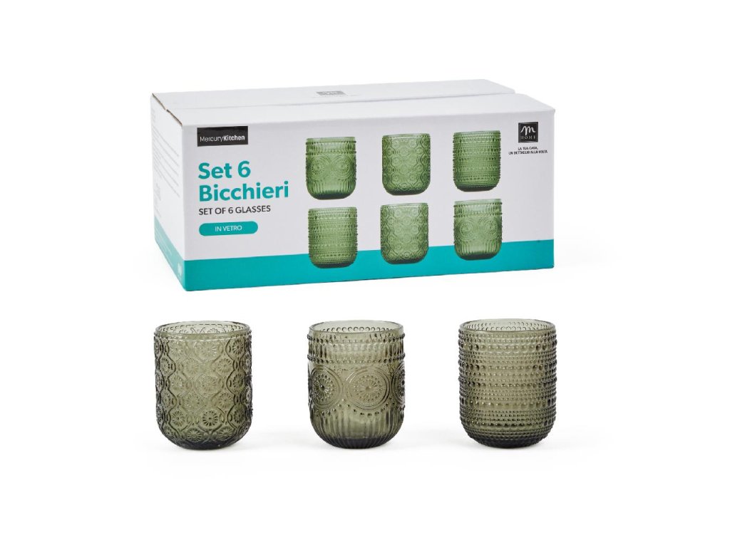 Rychlé info: Sada sklenic na vodu Grey od značky Mercury obsahuje 6 kusů o objemu 250 ml. Rozměr sklenice je průměr 7,5 cm a výška 9,5 cm. Sklenice jsou v různých dekorech a jsou balené v krabici (gift box).