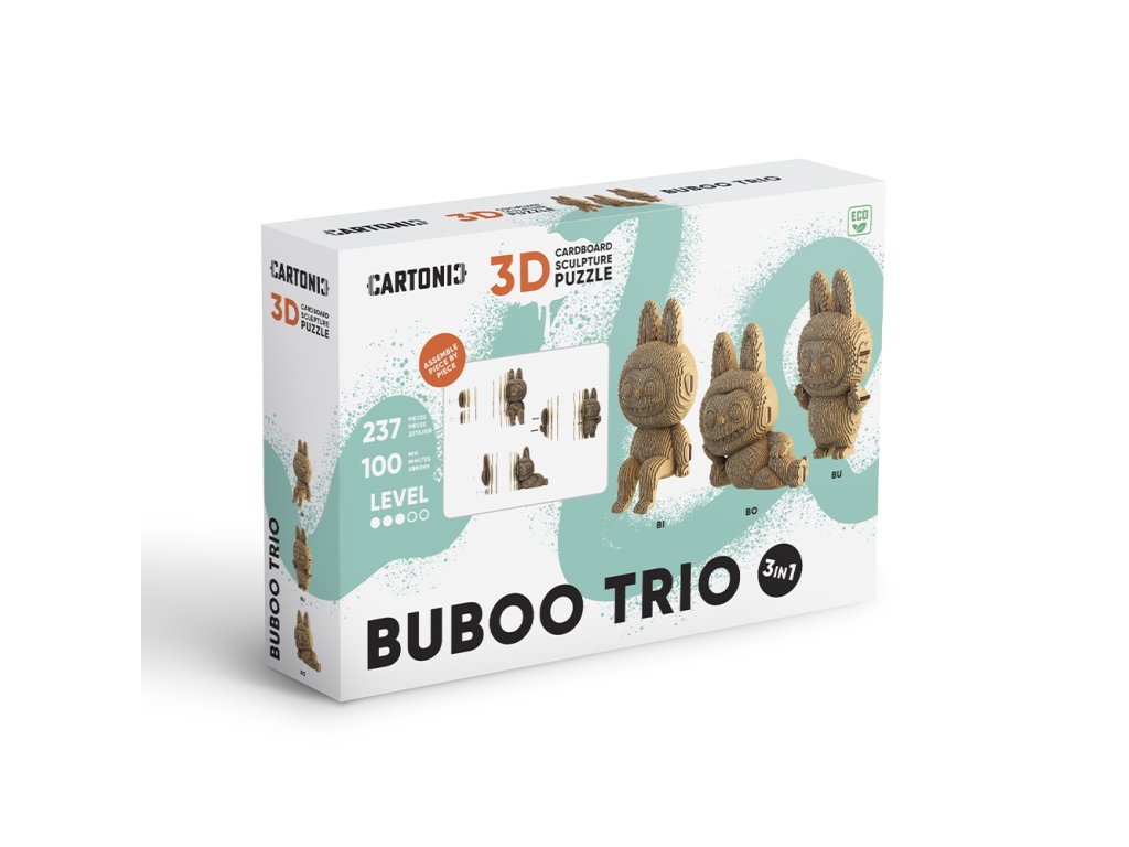 BUBOO TRIO jsou tři malé „monstra“ BU, BI a BO, každé s vlastním charakterem a výrazem. BU nejraději stojí a tváří se jako šéf, BI sedí a hází jeden vtípek za druhým a BO má nejdůležitější roli, celý den jen v klidu „chilluje“. Společně tvoří nejvtipnější partu, kterou si můžete postavit doma na poličku jako stylovou dekoraci. Skládačka Cartonic se skládá celkem ze 237 dílků z eko-kartonu a každou postavičku si můžete po sestavení nabarvit podle sebe, aby bylo vaše Buboo Trio opravdu jedinečné. Díky třem různým velikostem vypadá trio skvěle i pohromadě a funguje jako dárek pro kreativní tvoření i pro milovníky originálních postaviček.