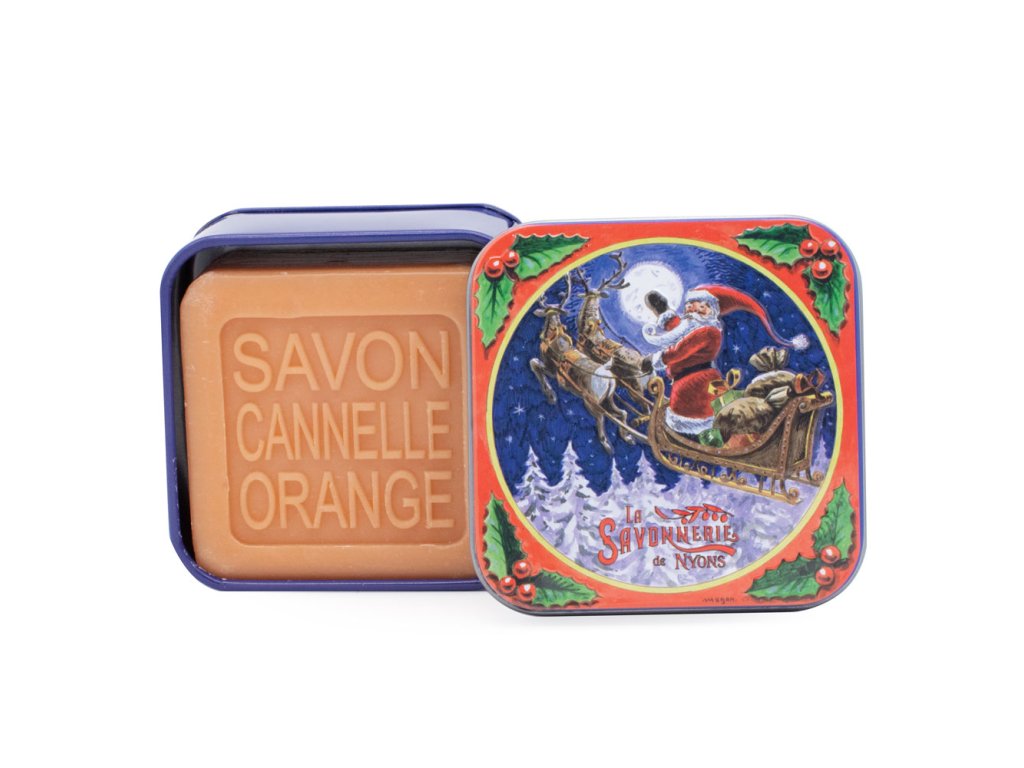 Francouzské tuhé mýdlo 100g v plechové dóze – Skořice a pomeranč, Vánoce – Sáně, La Savonnerie de Nyons