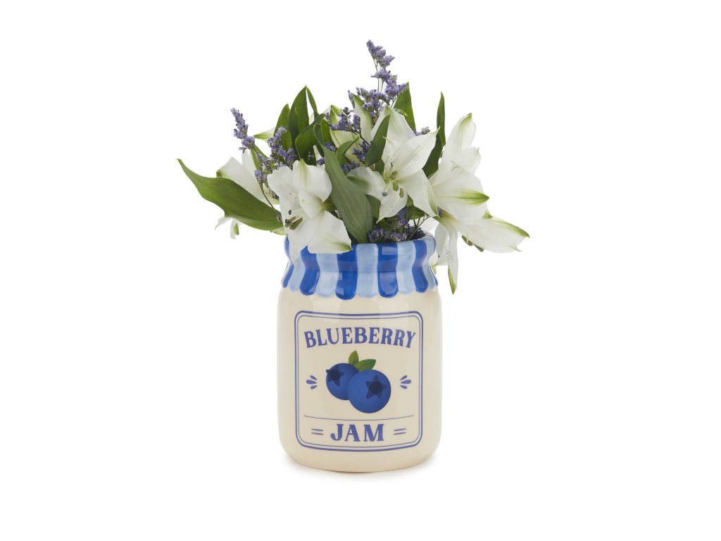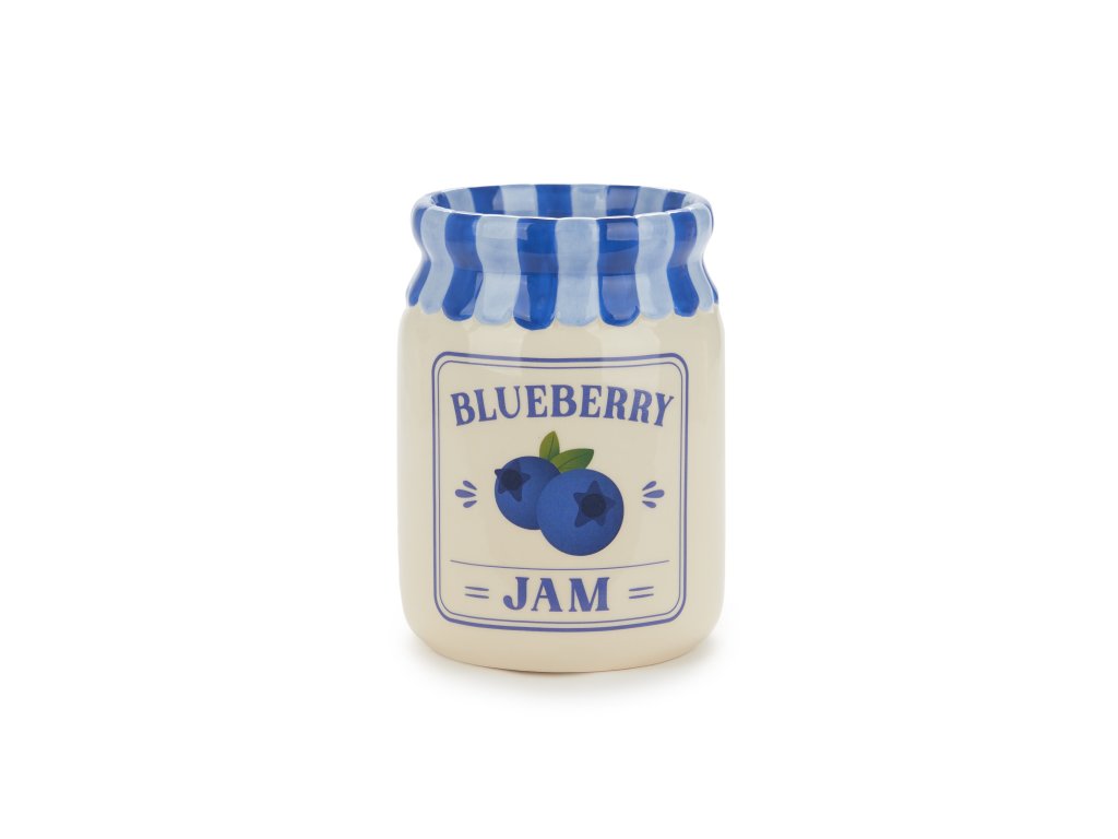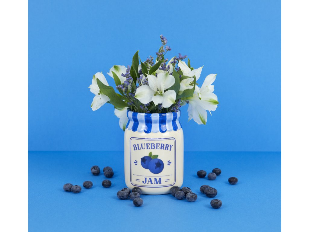 Mini váza Balvi Blueberry je keramická vázička ve tvaru sklenice od borůvkového džemu s vintage vzhledem. Hodí se jako dekorace na polici, stůl nebo parapet a zároveň může sloužit jako malý organizér na drobnosti, štětce či kosmetiku. Je vyrobená z odolné keramiky a má rozměry 12,5 × 8,5 × 8,5 cm.