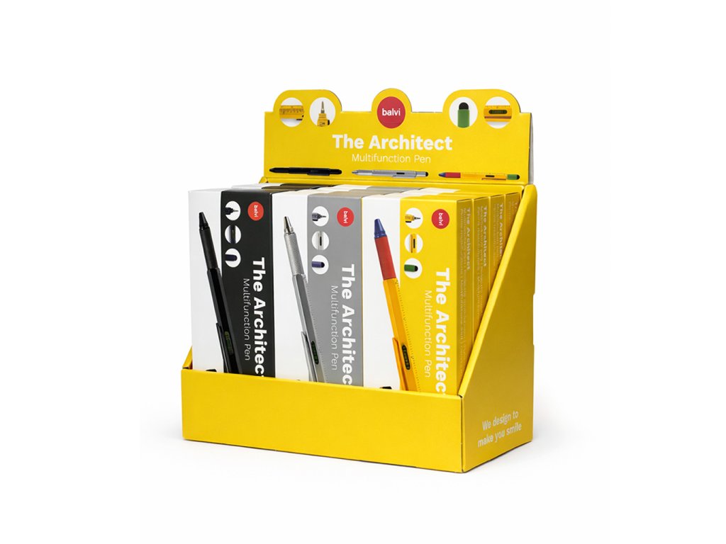 Balvi The Architect displej obsahuje 12 ks multifunkčních propisek 5v1 v mixu tří variant (stříbrná, černá, multicolor). Každá propiska kombinuje psaní s černým inkoustem, pravítko 7 cm, bublinkovou vodováhu, stylus pro dotykové displeje a šroubovák se dvěma bity. Je z hliníku, má protiskluzový povrch a kovový klip pro snadné nošení. Náplň je plnitelná a kompatibilní s D1. Produkty jsou balené v kovových krabičkách a displej je vhodný na pult i do regálu.