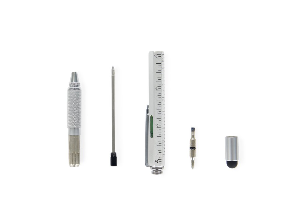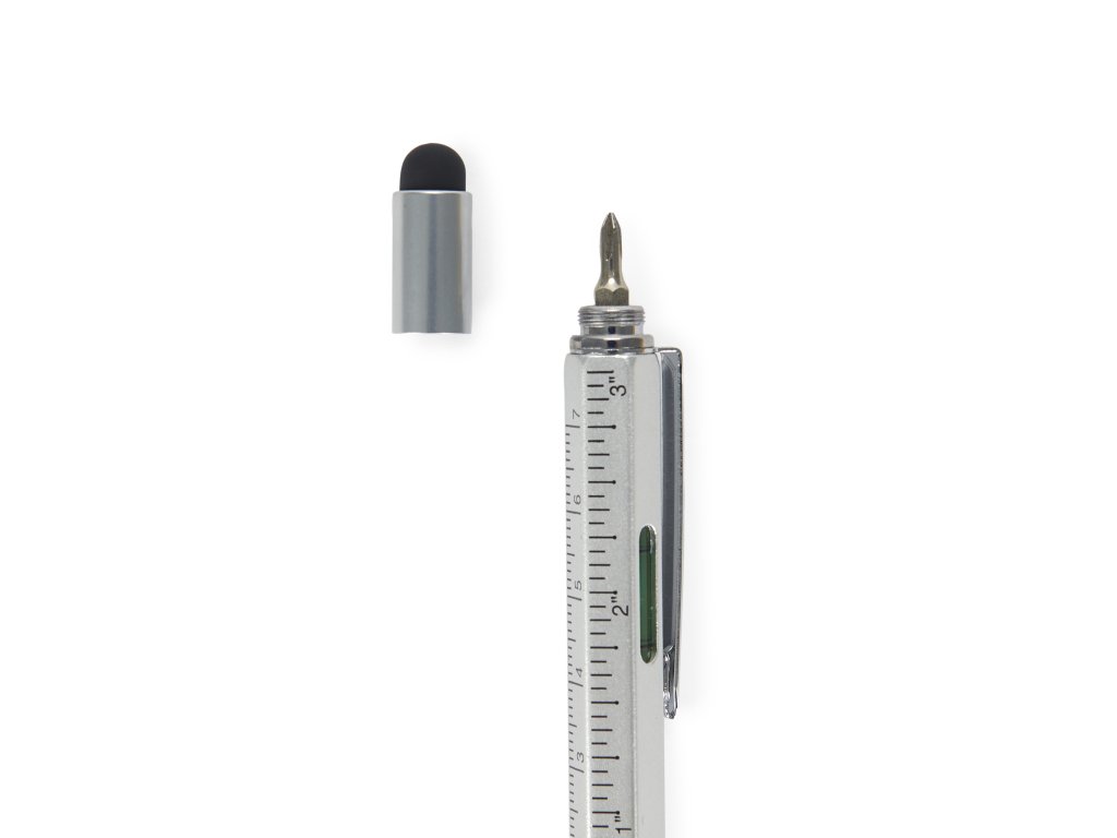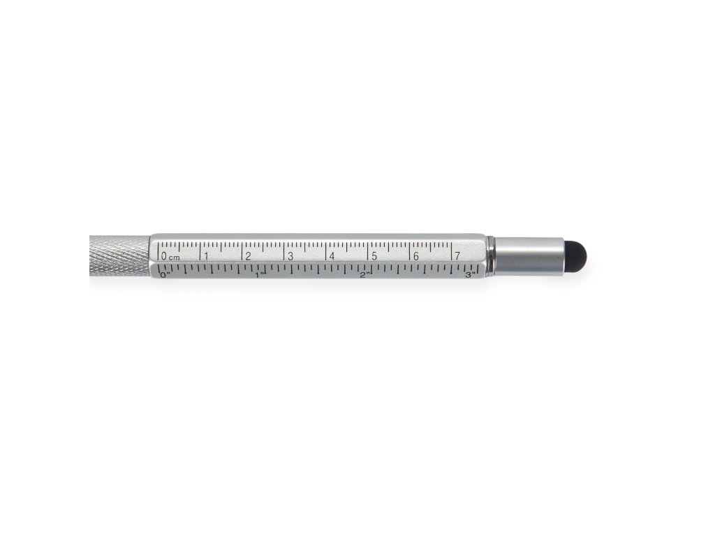 • Multifunkční 5v1 – propiska s černým inkoustem, pravítko 7 cm, vodováha, stylus a šroubovák se dvěma bity