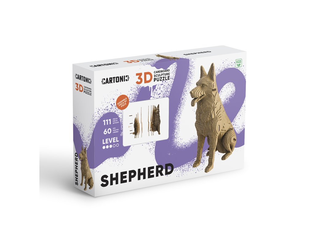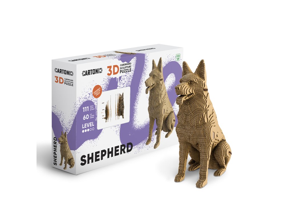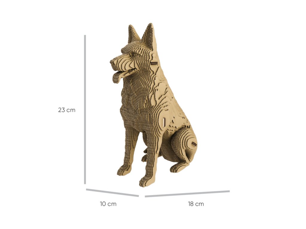 Značka: Cartonic. Typ: 3D puzzle skládačka. Motiv: Německý ovčák. Materiál: eko-karton. Počet dílků: 111. Rozměry: 23 × 10 × 18 cm.