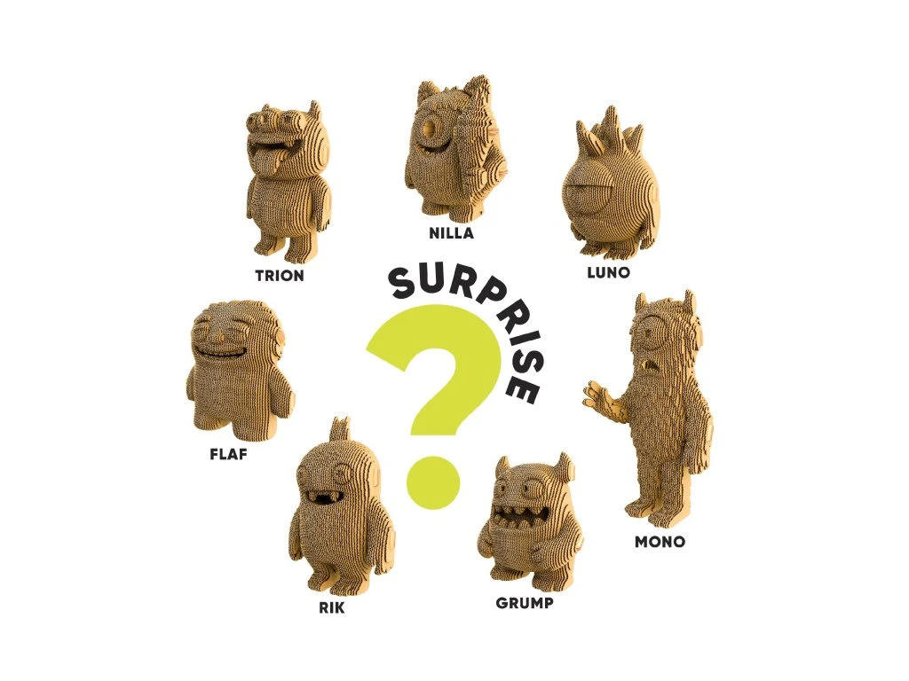 Surprise Cartonsters je sběratelská 3D puzzle skládačka Cartonic, kde se kouzlo skrývá v překvapení. Dopředu nevíte, která postavička vás čeká, v krabičce je vždy jedna náhodná varianta z kolekce. Postavičku si sestavíte z eko-kartonu a pak ji můžete nechat v čistém kartonovém vzhledu, nebo ji dotvořit barvami podle vlastního stylu. Výsledek funguje jako malý designový objekt do interiéru a zároveň jako zábavný kreativní projekt. Skvělé i jako dárek, když chcete darovat něco originálního a s momentem překvapení.