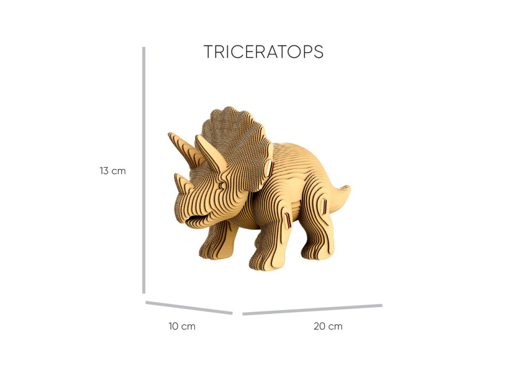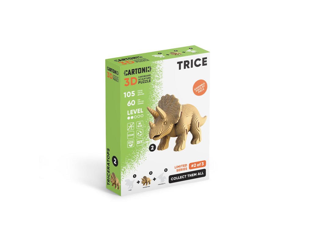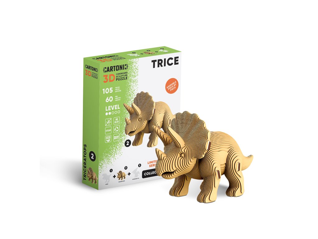 Značka: Cartonic. Typ: 3D puzzle skládačka (Collectibles). Motiv: Triceratops. Materiál: eko-karton. Počet dílků: 105. Rozměry: 13 × 10 × 20 cm.